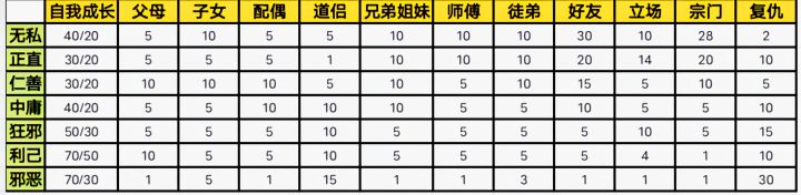 鬼谷八荒任务性格数据参考 内在性格 无私:自我成长40/20,子女10,父母5,配偶5,兄弟姐妹10,徒弟10,师父10,好友30,复仇2,宗门28,立场10 正直:自我成长30/20,子女5,父母5,配偶5,道侣1,兄弟姐妹10,徒弟10,师父10,好友20,复仇10,宗门20,立场14 仁善:自我成长30/20,子女10,父母10,配偶10,道侣5,兄弟姐妹10,徒弟10,师父10,好