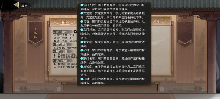 tap里有些人写攻略都是一逼带过截图完事,写了跟没写一样,出于对这种人的鄙视,所以来写一下个人的宗门的养成,供新人参考。宗门属性:这里说明了宗门出产逻辑,不想看直接忽略也可以宗门成员:用于天骄、老婆入宗、养妖宗以及宗门大比,真传和内门弟子会参加大比,战力高的扔进来(过于麻烦我不参加,做成就开个简单档就行)。调度权限:玩大比就永不调整自己搞,不玩直接忽略资源调度:用于宗门资源划拨,比如没有灵