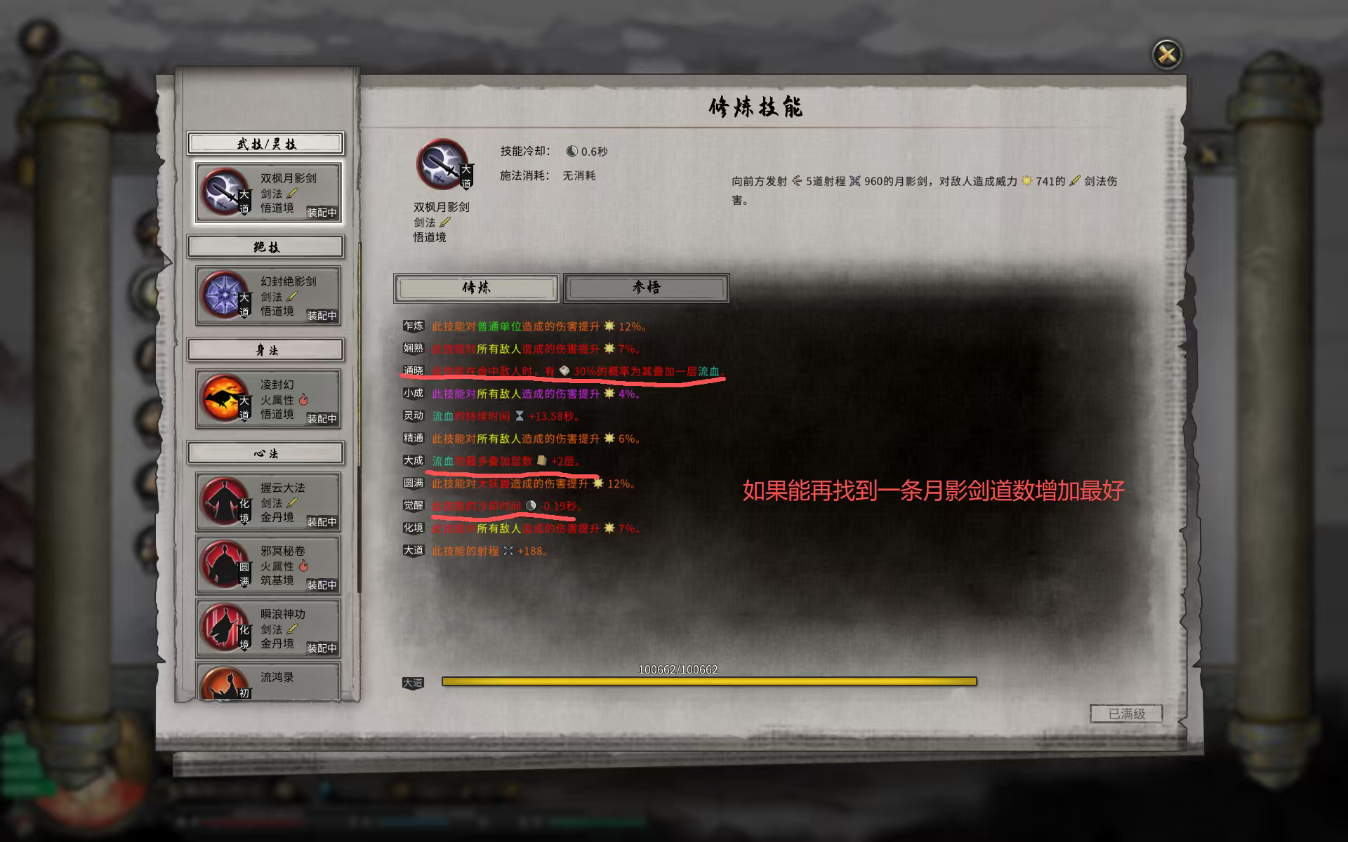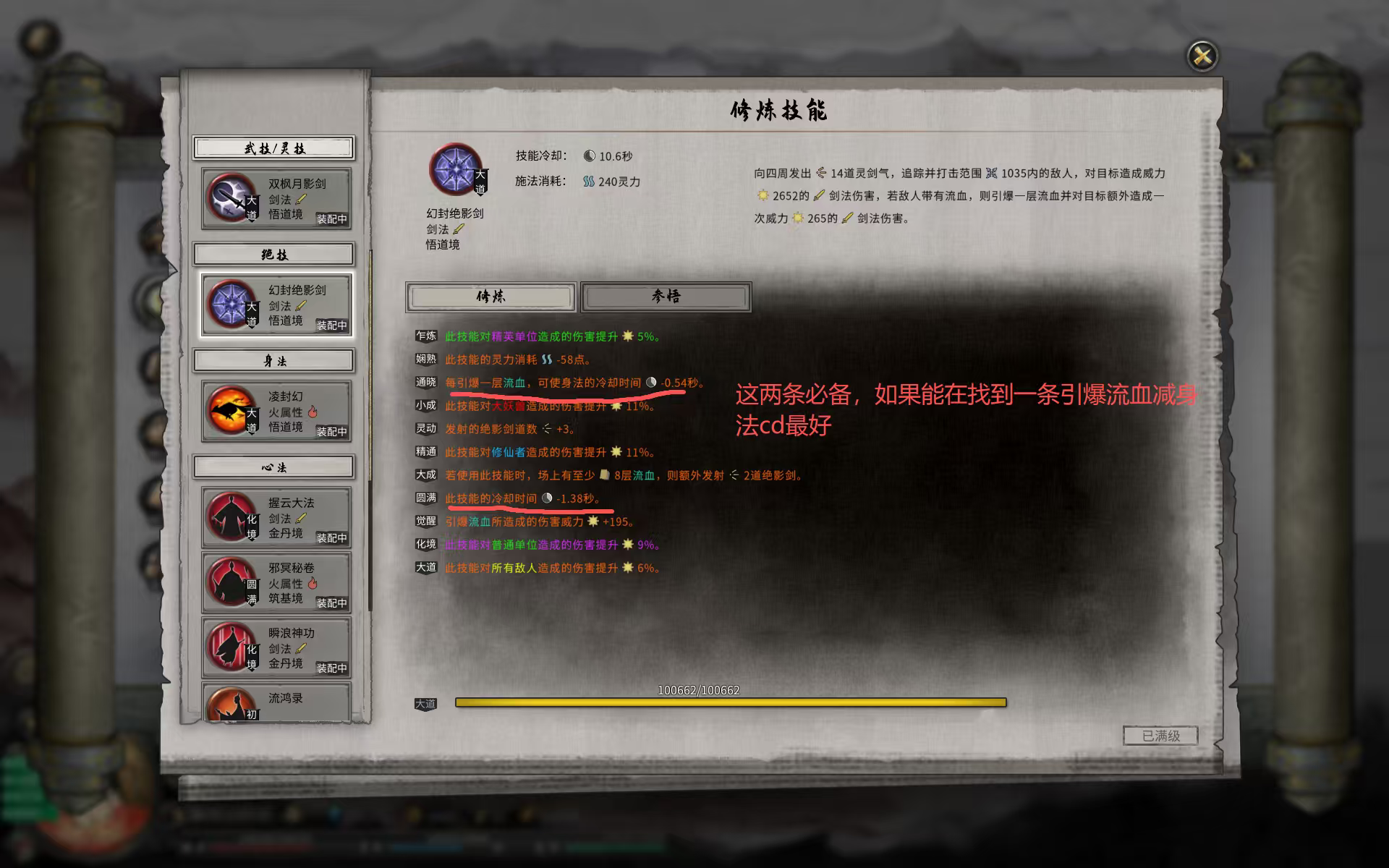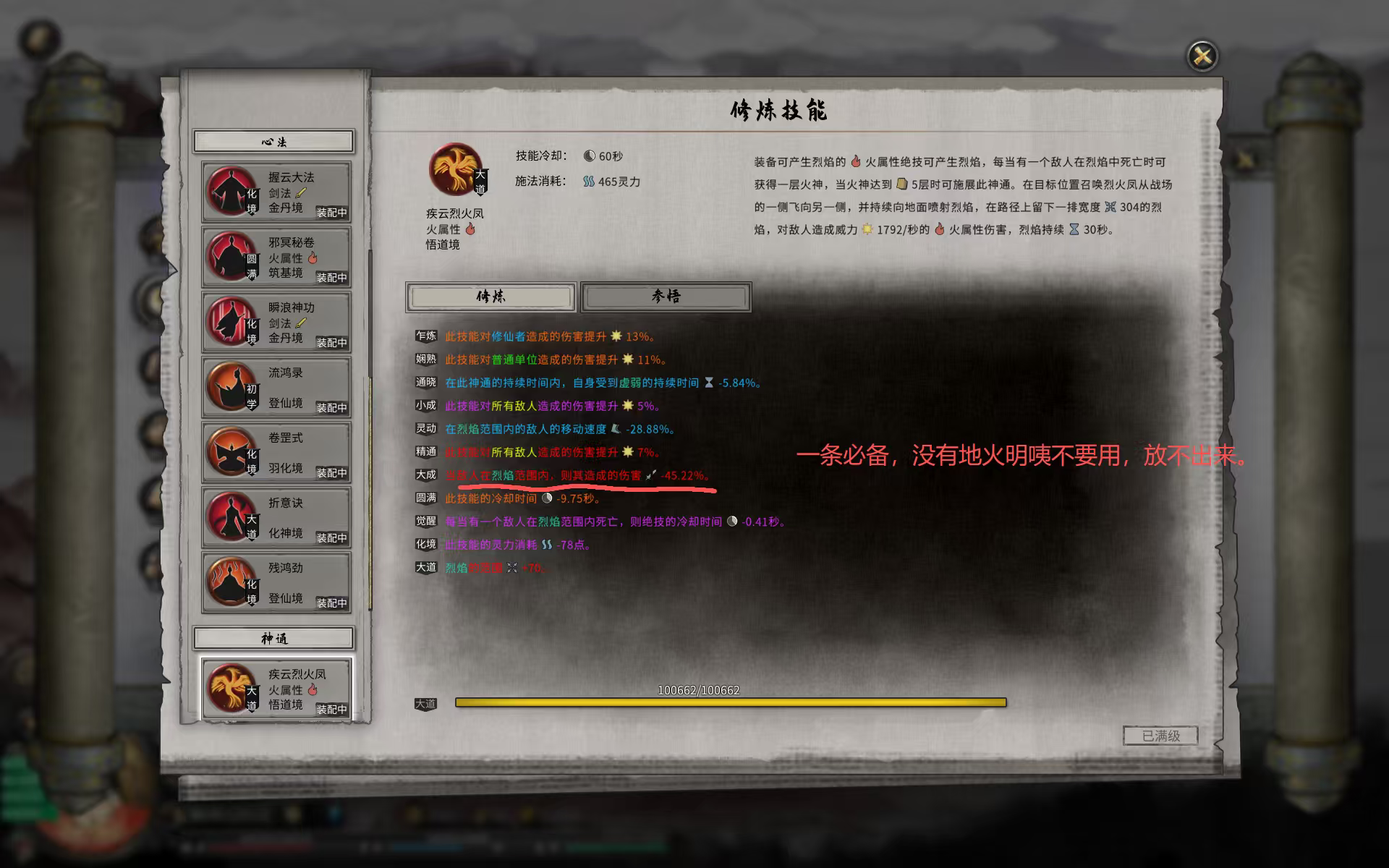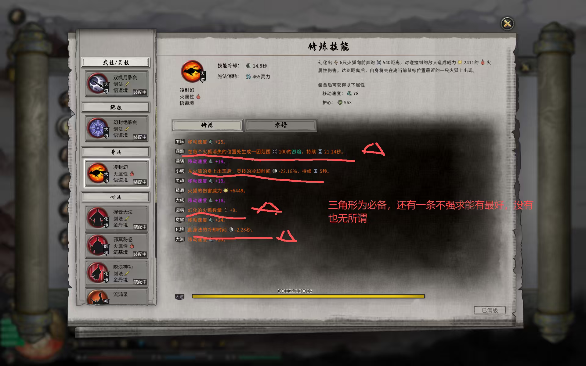1.不带封面这个生成烈焰团加伤的词条,或者不刷满要知道火增伤是本游最大轮椅,火增伤栓条狗都强;火增伤就建立在这个词条之上。可以说没这个词条就没火剑这个流派,这得把它供起来。它的最大数值是8%,请务必参悟刷满。火秘卷上其他的词条捆一块都没它金贵。2.武法系逆天拿满。火剑不靠武技输出,武技的效果只是叠加流血。由于火身法形态的问题,火狐奔跑的时候武技是停掉的,身法落地之后需要近半秒才能成功叠