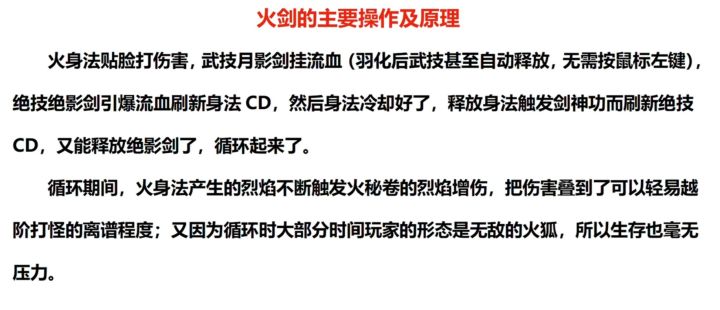 本篇分为四大部分:操作原理、逆天改命、技能搭配、其它选项不用烦,不用肝,火剑其实很简单!内容b站up主侍瑛植保侵权立删------------------------火剑的主要操作及原理 火身法贴脸打伤害,武技月影剑挂流血(羽化后武技甚至自动释放,无需按普攻),绝技绝影剑引爆流血刷新身法CD,然后身法冷却好了,释放身法触发剑神功而刷新绝技CD,又能释放绝影剑了,循环起来了。 循环期