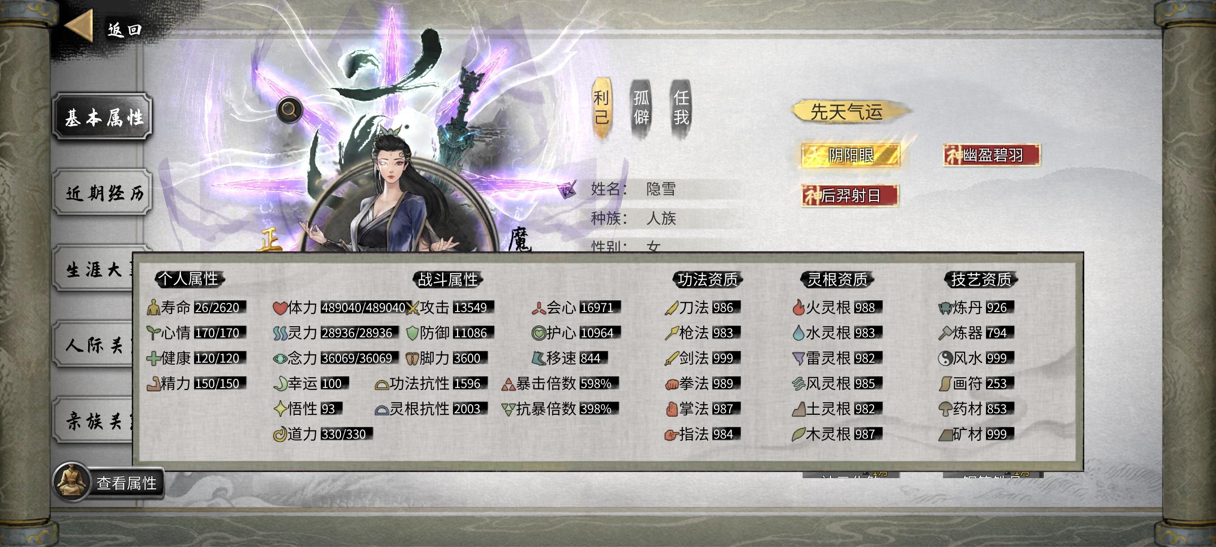 先进行名词解析:拿词条参悟来对比,数值固定即精炼出来就是完美属性。数值随机有上下波动,下图基本是完美或者接近完美属性(小部分属性是推测上限)。图左下角前者表示炼制出来词条数量和境界,后者表示满词条需要的境界。完美词条法宝炼制前就要存档,炼制词条随机,通过反复读档获得初始词条,后续每次升境界会解锁新词条(随机),继续读档获取满意词条。部分法宝词条仅初始炼制或者再次精炼才有,进阶法宝是不能获