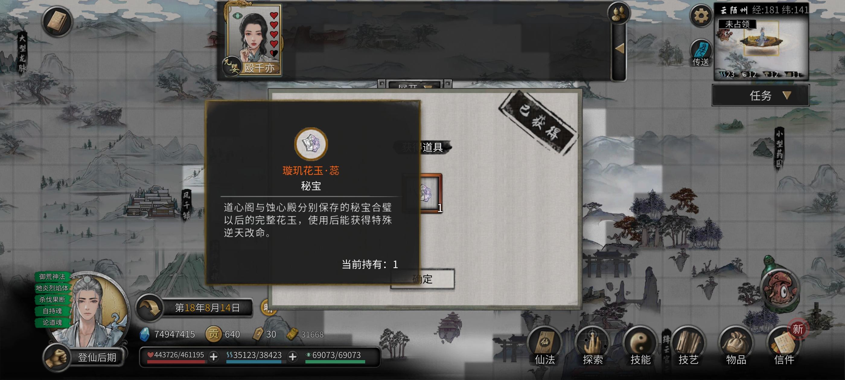 想必大家一定都有《花·玄》这个后天,论坛我死活没找到攻略,描述是跟背包里某个东西一直吸引,不知道是个啥玩意儿,我也是终于做完了,挺长的一个特殊逆天改命【我已经尽量把标题写的容易搜索一点了,如果有朋友不知道可以相互告知】先说一嘴这个我是登仙大圆满做的,可以看到我是十先天火剑而其中一个小任务给我打掉了1/5的血我纯站着普攻打,所以建议境界高了再去做那么开始正文↓首先图一后天,在云陌州触发,这个