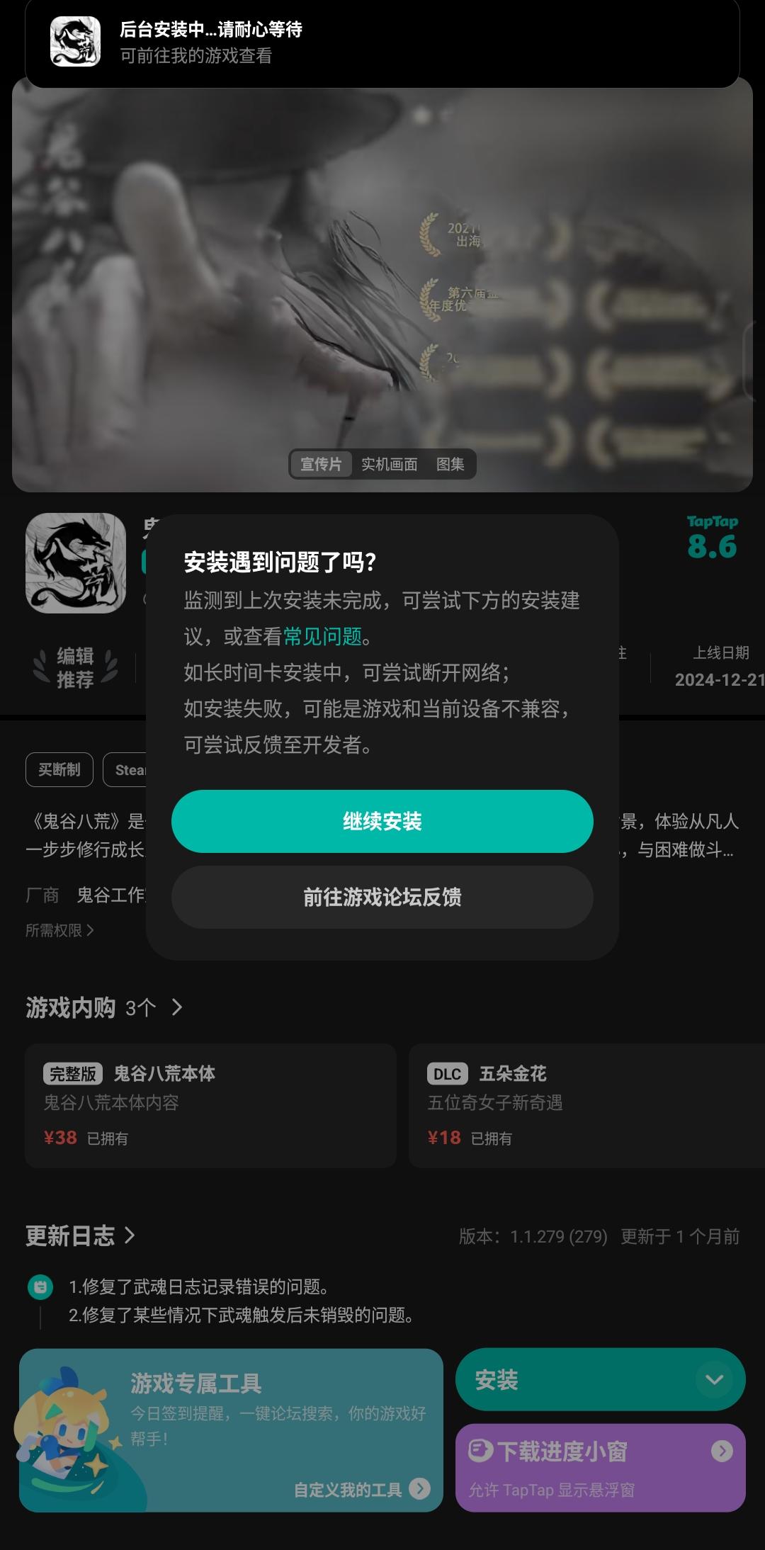 从1.1.230更新到目前279版本安装不了,断网试过了,手机空间还有190多g,手机是rog9pro,手机更新到了最新版本安卓16