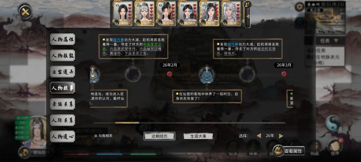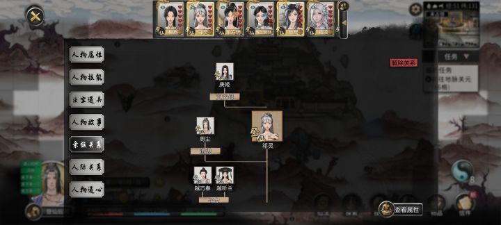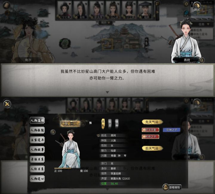 起因是她的一个女儿在跳月的时候偷我东西,然后就教训了一顿,还给做掉了然后她的另一个女儿过了几个月跑过来找我报仇,我又给做掉了,然后我看她的关系网,发现她俩有个妈,我就想着两个女儿都做掉了,那把妈也做了吧然后我就找到她们妈,结果一看好感度是正的🤣还单身忠贞(真的很难绷,有两个女儿,结果是单身忠贞)而且还是八荒第一拳修,我干脆直接给她俩妈拿下了,然后我看她的事迹,发现她经常揍自己女儿