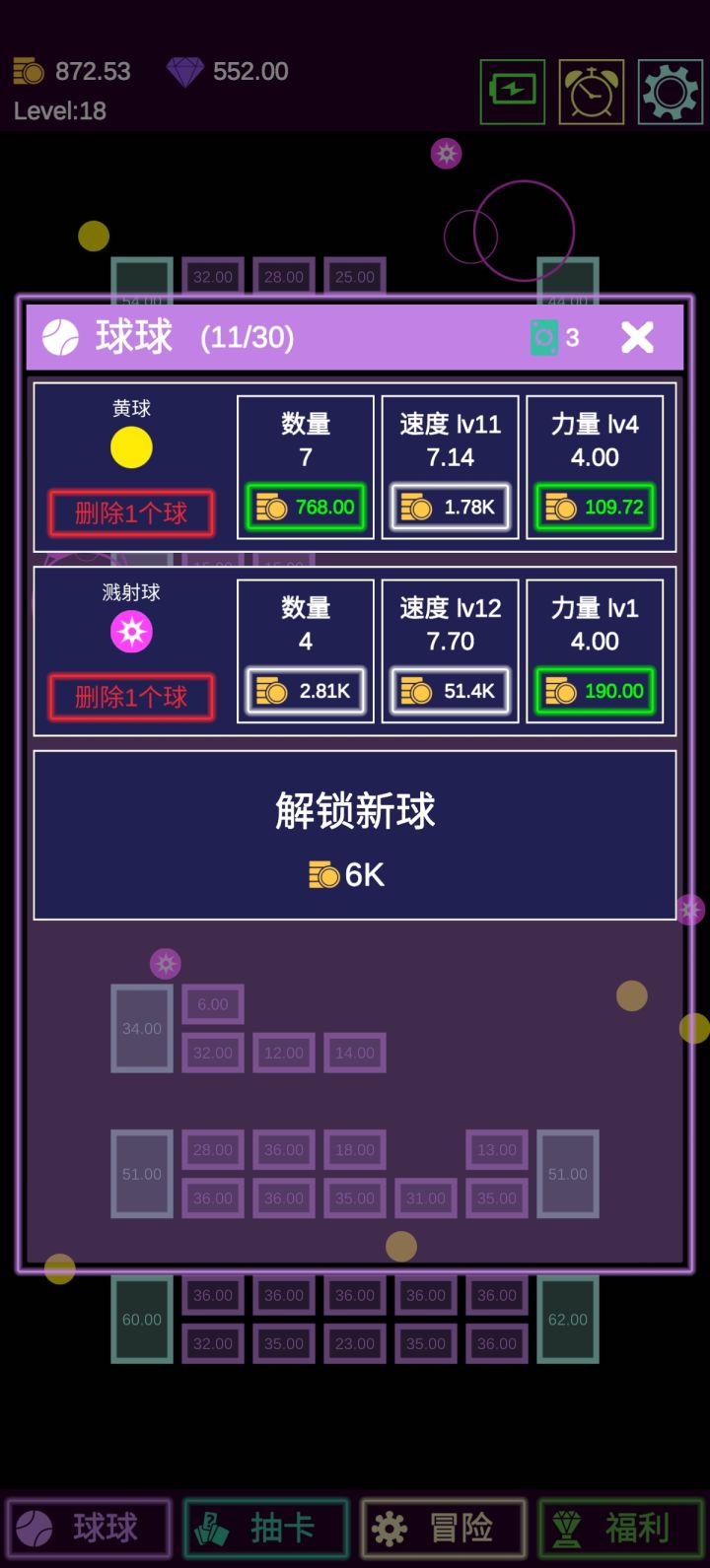 前期离解锁新球差距比较大的情况下,在保证力量接近砖块血量的情况下,所有资源尽量去升级小球速度,同时尽可能多的购买新球,后边解锁更多种类后可以适当删除一些前期球。