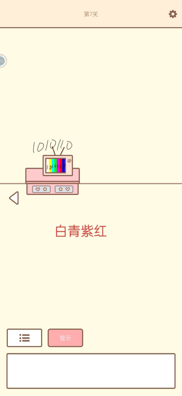 首先已经通关了,第七关怎么弄都不对,于是看了广告提示,但是!你这个颜色是不对的吧?且提示里还有错别字。