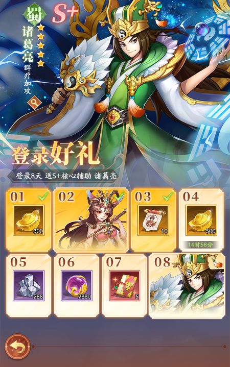 武将简介:诸葛亮是位治疗且增攻击力的辅助武将,释放技能还能增加友军的怒气。普攻:对敌方纵排造成法术伤害且回复友军生命值最低单位生命值。技能:给友军全体回复生命值且增加攻击力。天赋:9星特性:释放技能给自身回复一点怒气。名将1星:释放技能给全体武将增加暴击。名将3星;释放技能有50%再次释放技能但回血与加攻效果减半。神将1星:释放技能百分百回复两点怒气。武将获取:诸葛亮可以通过将军
