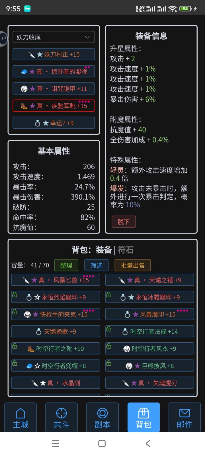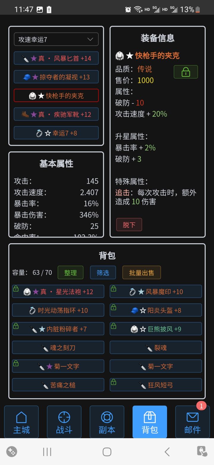 继上篇攻速,以及个把月时间历练后,目前攻速套几个常见配置如下常见如图一:攻速重击流,阳炎、星光判定,衣服可换快枪手的夹克、头可换真★掠夺者的凝视特殊(爬塔):攻速暴击判定,如图三图四(鞋子还有个疾风20%判定鞋),走暴击判定幸运7流派,优势是有真★幸运7的命中10%,打高防抗暴高闪避怪优势大,综合来说和谁都能过俩手,55开,没有突出方面攻速篇暂时完结,待后面看是否有新的远古装备出现