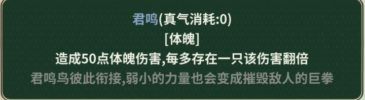 众所周知君鸣鸟数量越多伤害越高,而且君鸣鸟召唤是无上限的,并且一回合内只要材料够就可以无限召唤。也就是说,只要我方不被秒,且敌人没有清场功法,就可以通过制造大量君鸣鸟打出极高伤害。
