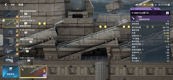 优点:高伤害,激光制导,范围性伤害 ,弹速较快 缺点:装填速度缓慢 ,国服激光制导导弹不吃香 容易被拦截 ,需要手法 总结:你游最好的激光制导导弹之一 ,但奈何国服环境由于延迟的这类导弹并不吃香 ,但总的来说还是挺不错的 #现代战舰