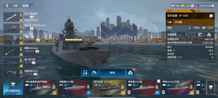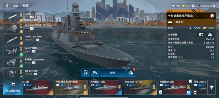 这船的含金量无需多言,十个攻略九个会推荐这艘船。首先是搭载了三门主炮,这就代表如果地平线用ARX500歼灭者的话一轮可以打出7万的伤害,三轮就可以击沉一艘船,并且这门炮弹速极快,基本上不会空,可以说是目前打匹配和刷活动最好用的一艘船,实测最快只需要一分半就能通一把护航。导弹带s300就行,除去战斧这种核弹外其他导弹伤害都在六千到一万出头这个区间,在综合考虑后带s300是很不错的选择,兼顾对海和