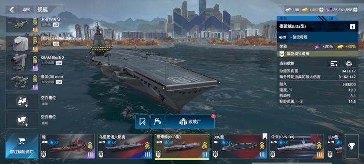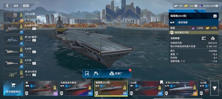 最近航母003号服役,现代战舰也是把003免费送了 所以特此出一篇平民美金向航母攻略。火箭炮和055那篇一样,只能用726,不过这个月签到会送一个还不错的火箭炮,如果能拿到的话直接用就行。攻击机用f35,也许很多人会说,我看攻略都是用歼26或者用fc31啊,这个是因为你看的攻略已经很老了,现在基本上没人做平民攻略,因为国际服有市场,所以国际服的萌新和平民也能拿到不错的装备,我刚玩这游戏的时候就