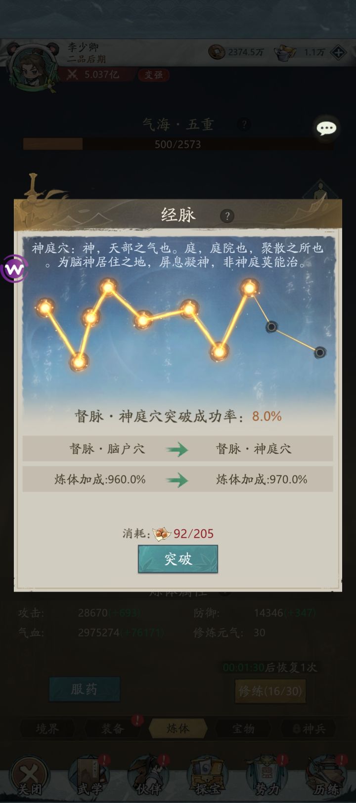 练体筋脉中督脉神庭穴的突破概率一直是百分之8吗,好几万 通脉丸下去了,一直突破不了概率也没涨