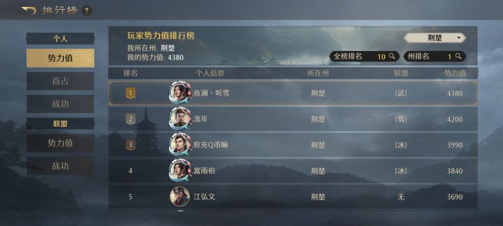 当诸位主公进军司隶,正是《偃武》上演巅峰对决之时,阿武回想起上一测司隶多方混战,至今仍心潮澎湃。不过现如今的入关形势似乎又与之前不同,1区决战甚至可能提前开打,诸位主公请看烽火测试司隶开关前各方备战情况。1区 群雄并起截至12:00,1区同盟战力排行榜如下,【大江山】和【战斗风】依旧差距不大,分别占据榜一榜二,然而【大江山】盟友【CAE】也有着不俗的6亿多战力,排名第四的分盟【江山梦】亦是牢牢