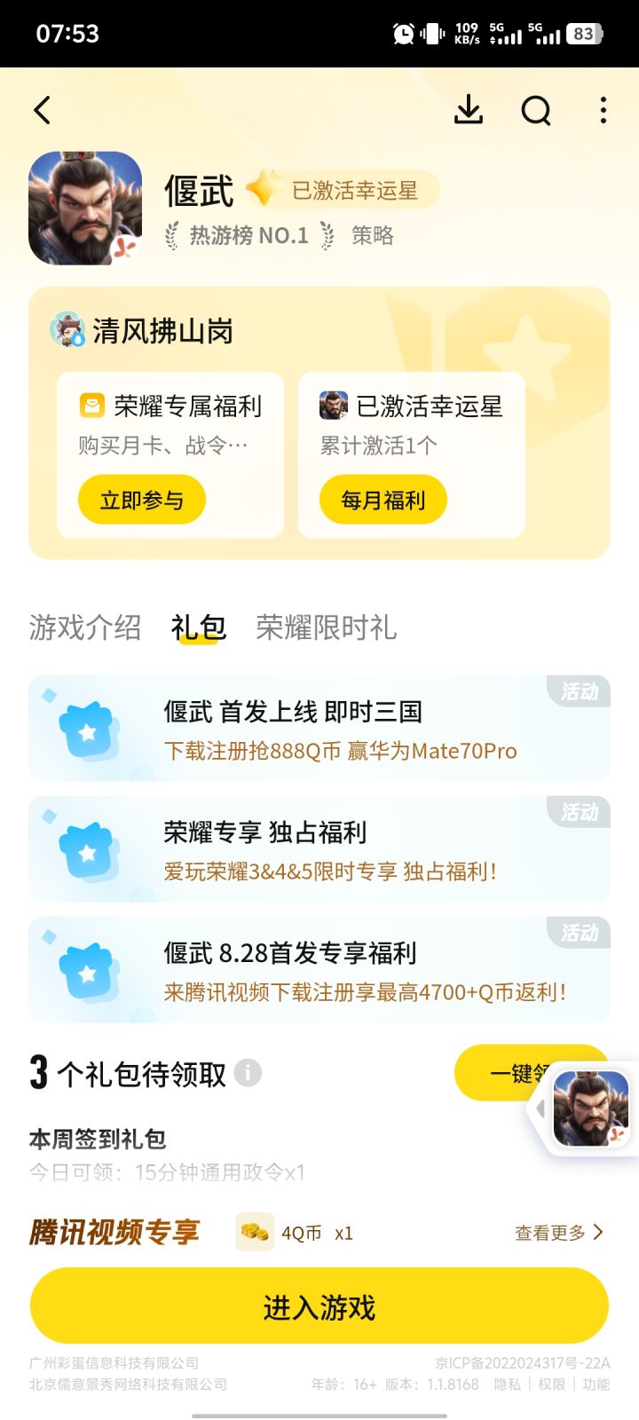 qq游戏中心可以领取签到礼包和一次性奖励qq浏览器同理,腾讯视频也可以领取一份还有心悦俱乐部里面也有签到和奖励礼包在taptap上面每日签到也能领礼包这些东西全部加起来也有几十个小时和上千万资源了。如果还有大佬有其他福利领取望留言区分享一下。最后送上通用礼包码YW6666YW8888YW2025YW9999YW0828