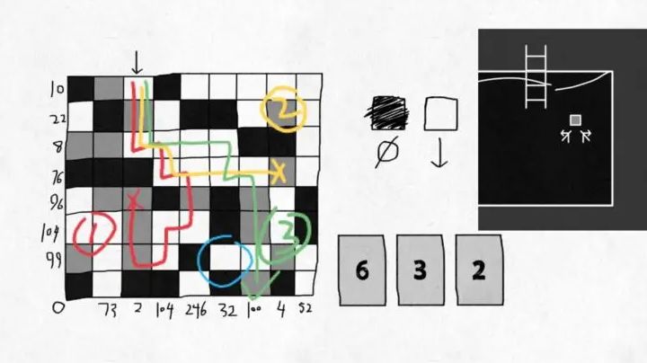 算不上攻略论坛里已经有一份完整的攻略了,跟着通关是没问题的。但可能会有人对解谜的思路有疑惑,所以整理了部分相对有些难度的谜题写了解析,希望能有帮助。这个提示给的其实有点误导,两个箭头和围着两个箭头的圆圈应该分开来看。首先观察这个魔方,这三面都刻着不同的符号,并且颜色都不一样;其次再观察单独的一面,会发现外面一圈和中间方块的颜色不一样。结合提示,先不管圆圈,只看箭头,可以得到第一