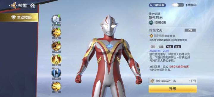 大家好,今天继续跟大家聊超时空的PVP,这次主角是梦比优斯勇气形态。这个英雄玩起来手感非常飘逸,技能全是位移和斩击,特别适合喜欢高机动性、秀操作的玩家。以下是我个人总结的一些心得,给大家参考一下。先来看看他的技能特点:· 普攻:三段连击,出手速度还不错,是贴身后补伤害的主要手段。· 一技能:光剑迅斩。核心突进起手技,能高速冲到敌人身边进行斩击。用了之后,10秒内能接一个呼出技【空翻切割】。·