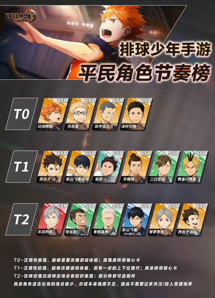 《排球少年:新的征程》国服将要公测啦!是不是,还不知道要练哪些角色?看完这篇你就知道啦!!本篇内容将结合启程测试、外服版本等内容整理了PVP节奏榜。当然,一家之言,欢迎有理有据的评论。开门见山,强度榜如下:T0:日向翔阳、及川彻(练习)、田中龙之介、西谷夕、泽村大地T0.5:岩泉一、灰羽列夫、东峰旭、黄金川贯至T1:青根高伸、笹谷武仁、二口坚治、菅原孝支、影山飞雄(北川第一)T2:缘