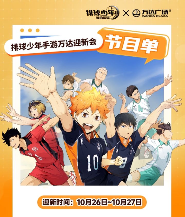 !!!最新情报来噜!→→10月25至31日,超40+万达广场将每日早10-晚9(每15分钟循环)为小排球【大屏应援】!大家千万不要错过!前往的小伙伴不要忘记返图鸭!!!⭐️参与方式:(2个条件都需要满足)✅前往指定万达广场服务台,分享大屏打卡照片至微博/小红书/抖音(需带话题 #排球少年1025新的征程#)✅出示排球少年手游游戏主界面。⭐️打卡时间:10月25日-31日⭐️周边福利:胶