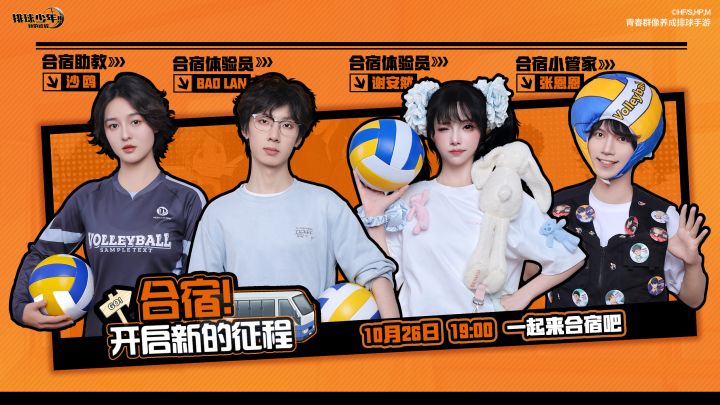 合宿直播特邀嘉宾首次亮相!🎈排球少年手游《排球少年:新的征程》将于10月26日19:00开启直播,期间将邀请四位合宿嘉宾助力直播!🔻他们分别是:✨合宿助教@原是沙鸥✨合宿体验员@Baolan-✨合宿体验员@谢安然✨合宿小管家@张恩恩NNN🏐排球合宿嘉宾阵容集结,史无前例的游戏路演形式,花式排球合宿体验,一起穿越吧!🏐踏入排球少年合宿基地!让我们一起回到合宿的那个夏天吧~#排球少年