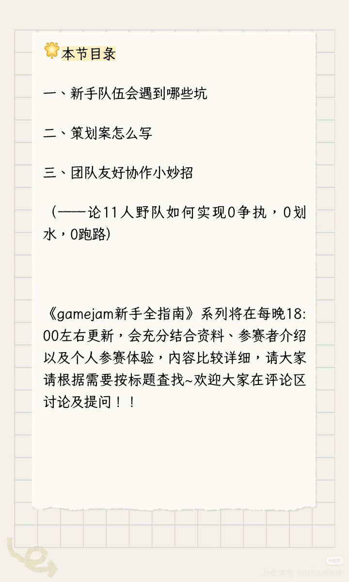 ⭐本节目录一、新手队伍会遇到哪些坑二、策划案怎么写三、团队友好协作小妙招(——论11人野队如何实现0争执,0划水,0跑路)《gamejam新手全指南》系列将在每晚18:00左右更新,会充分结合资料、参赛者介绍以及个人参赛体验,内容比较详细,请大家请根据需要按标题查找~欢迎大家在评论区讨论及提问!!#gamejam #TapTap聚光灯独立游戏 #发现好游戏 #游戏制作 #