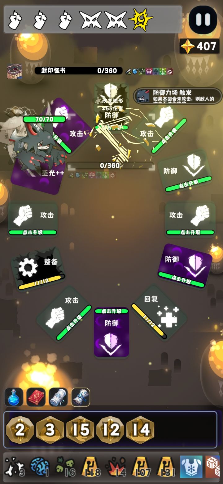 20分钟结束站原地不动看广告开英雄,点词条升级格子的开局星星的,进游刷圣光刷不到直接退,目前最多刷了五把很好出。上重甲站原地不打怪站在圣光格子里一直扔骰子就行不打怪怪就打不到你加上圣光属于回合后伤害不算攻击。碰到封印石扔几个骰子一直结束回合就行他词条减伤。