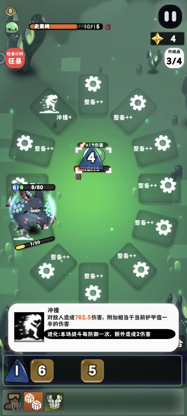 只能说这角色被动太超模了,压根不需要什么天赋道具,开局先走攻击打死个怪,最好用小点慢慢打,只要保证自己不挂就行,然后攻击格经验满了优先升整备,没有就升防御,打死一个小怪后,你就无脑在防御格子丢骰子刷经验就行了,把经验刷满,都升整备,如果出冲撞可以先拿一个,但是最多只要给1-2个格子升冲撞,其他全整备,因为有被动,哪怕怪狂暴了也打不动你,你就一直刷经验,格子经验满了你甲估计都2000了,一个冲撞就带