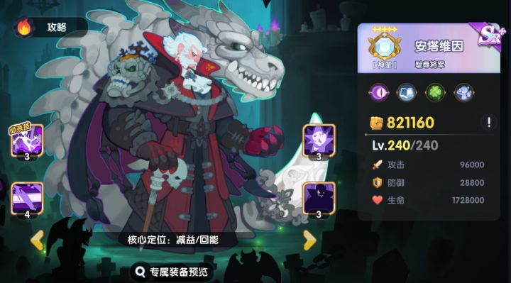 接下来登场的是光暗毋庸置疑的超强c位,女爵超强单体输出,无比强大的deff,毋庸置疑的超强主C。培养他你绝对不会后悔。1技能 亡魂哀歌:超高加成单体持续伤害,免控,目标有诅咒debuff还能额外增强buff。2技能 诅咒啃噬:debuff技,减少敌方c位暴击率 还是超高爆发的前提buff。3技能 哀魂遍野:范围高伤害aoe 专业突破前排还能附带debuff。4技能 死亡