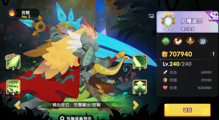 迎接你们的王——厄隆迪尔控场小能手,击退 击倒,林系专属小坦。1技能 正义裁决:上阵林系队友超强buff、范围高伤aoe2技能 破阵之锋:击退,击倒,小控场,增强自身防御。3技能 璨月之力:屈指可数的回能机。4技能 稳固之心:大招放的越多 越肉。(推荐搭配花仙子)专武升级后,坦度进一步上升,还能给队友回复,添加防御buff。英雄故事 厄隆迪尔是孤傲的阿瓦瑞翼人,其剑术宗师的威名响彻
