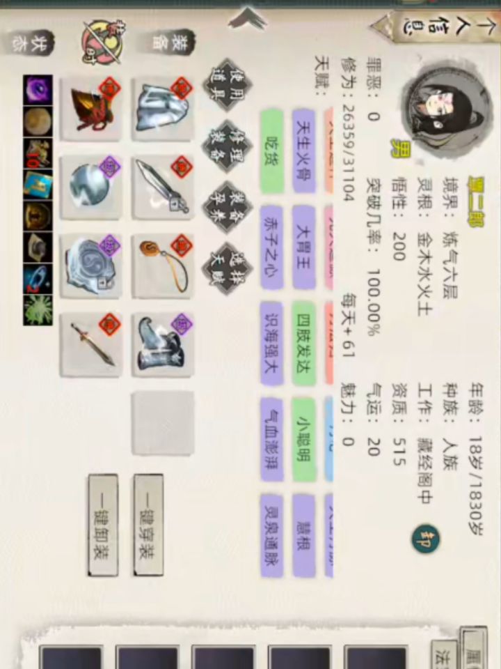 经过前两篇大家应该是处正修练中了,在这闲暇之余,我们来学习一下如何快速修炼提升境界。快速修练法游戏里每天(现实10秒)都会增长修为但基础只有10/天,随着大境界提升基础会提升,这个修炼你就算是离线了也会加的所以不必一直在线上。①灵根:优先单/双灵根,加200%或120%修炼速度香的很。②天赋:完美主义、懂王、怪癖、经脉贯通、追求长生(可能会与其它天赋冲突)都是修练好手③特殊技能修练: