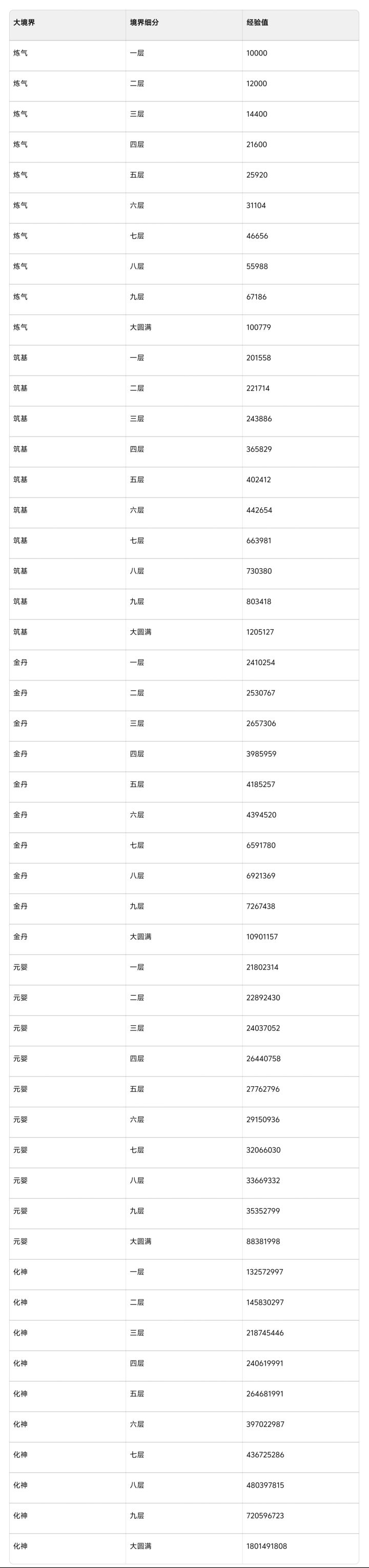 大境界突破表与各个境界要的修为(最新版)
