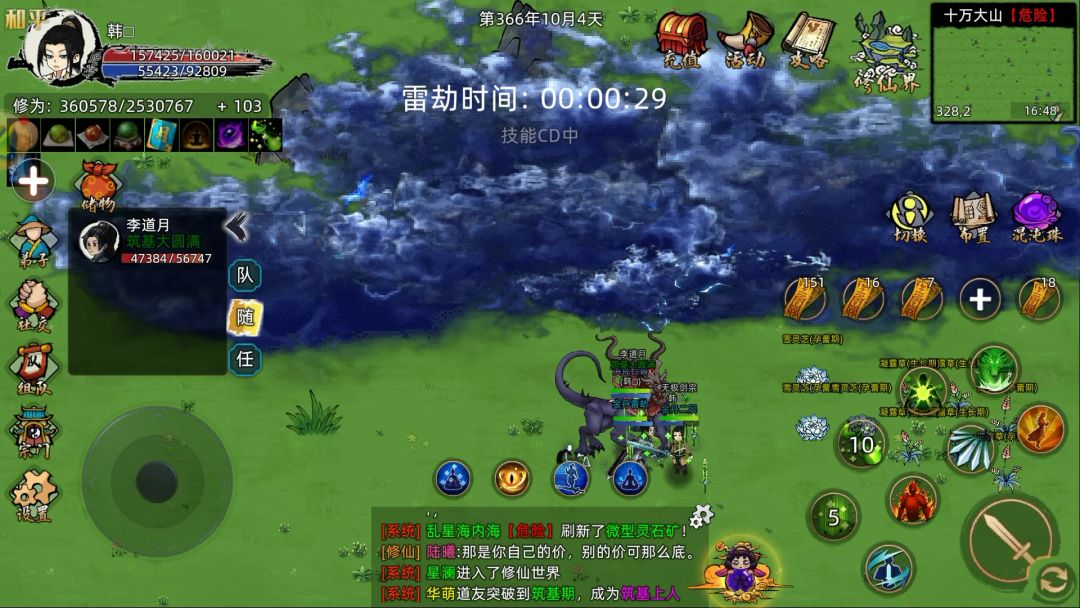本来护法朋友突然不在.都打算晚点渡劫了. 突然吧.想到要不要试试不操控弟子.主角强行奶.但是记得退出操控会失败.可我记得是退出操控是默认超范围.正好丹buff还有2分钟.....那么...我在范围如何????? 具体操作看视频.前面部分打开录像没有点开始.渡劫弟子图我放评论区了
