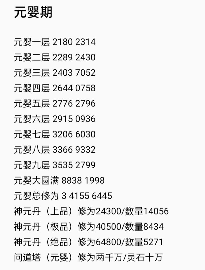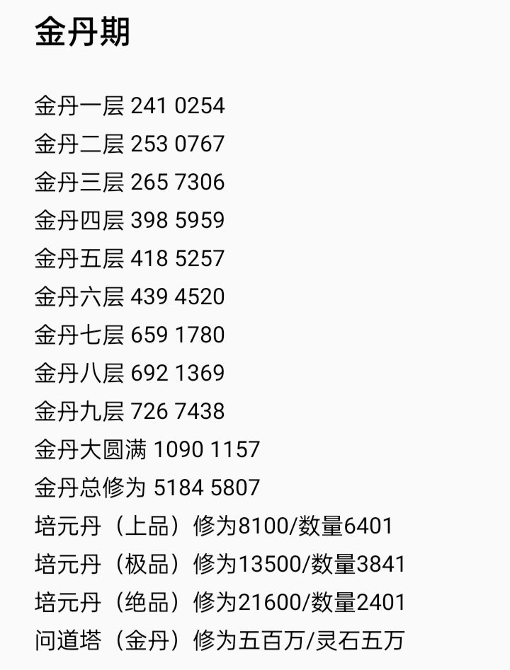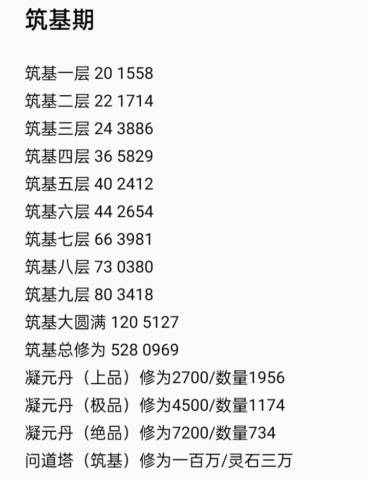 如若觉得不准,可以自己去算一下。境界修为在各个区的排行榜查看,丹药修为在摆摊收购列表查询。🍂━━━━━━━━━━━━━━━━🍂推荐只攒练气、筑基的极品绝品修为丹,易得、易出。金丹的时候可以放缓一下速度,用中上品边修炼边刷洞府。等到元婴、化神就用灵石,在问道塔进行加速修炼。金丹洞府5-20万灵石(数量根据本人刷洞府所得,因为就刷过几次,如果有误差可以在评论区留言)。#修仙家族模拟器2#游戏攻略