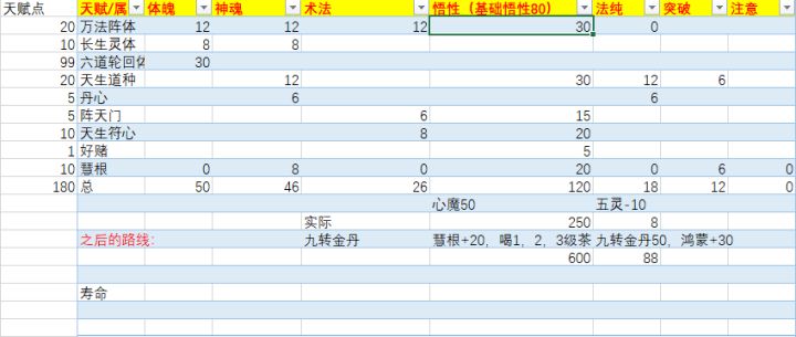 自行推演:“长生仙体-轮回法则”五灵王五灵王五灵王以元婴大圆满转世的功德为基础!!要求:5000年寿元+600悟性+100法力纯度路线:血灵煞筑基-九转金丹-万法元婴-轮回法则以此为准,需要补充的:悟性600-(三二一悟道茶200+100+50+50斩心魔)200悟性法纯(100-50九转)50法纯方法①天赋:长生仙体(180),万法阵体(20),天生道种(20),无垢灵脉(