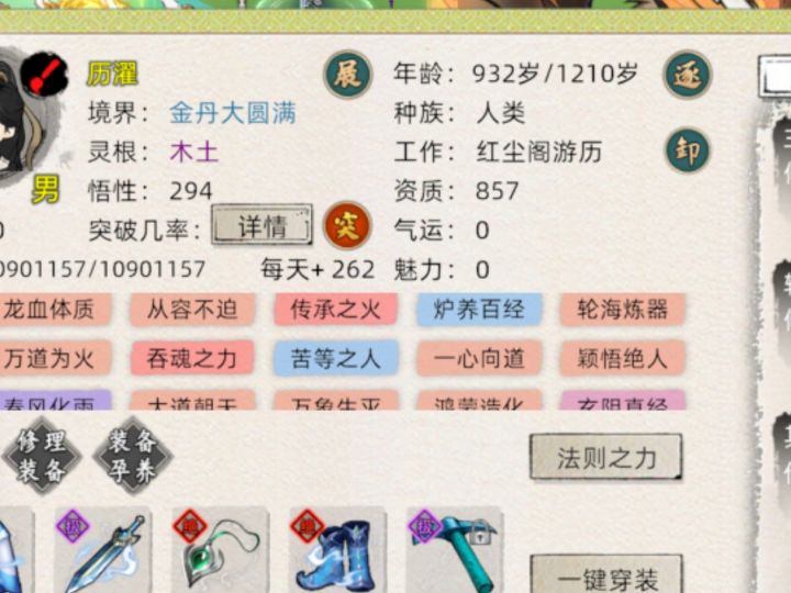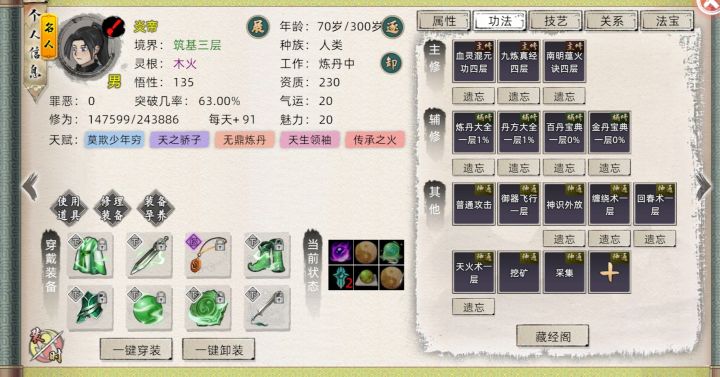 本篇主要介绍有关炼丹、炼器、阵法制作、法宝制作等功能。①功法辅助在藏经阁生活辅修类有炼丹,炼器、炼阵、炼符、灵植等辅修功法,同时五种灵根的主修功法也对应有各种生活技艺加成,其中火炼丹、木灵植、土炼阵、水制符、金炼器,都以提升辅修属性为主,我们直接找对应灵根弟子学习相应技艺功法。②辅修属性加成以一阶修为丹为例,1点炼丹属性提升基础效率与基础成功率1%。这里说的提升1%,不是指成功率直接加1%