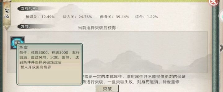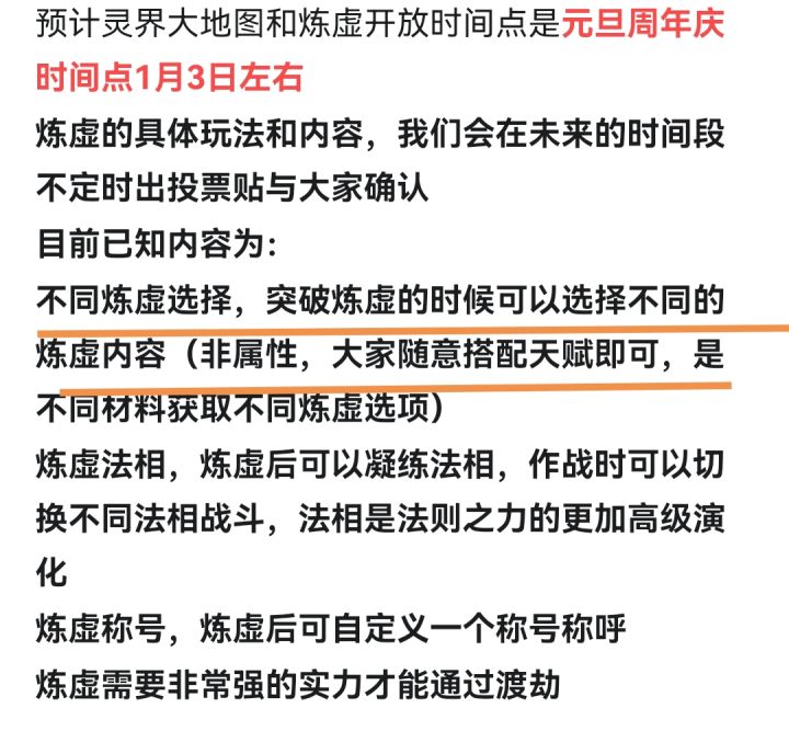 距离第一个玩家达到化神大圆满满经验,已经两个月了。官方迟迟不公布炼虚要求,咨询客服,客服回答是“玩家自行探索”。行吧,官方您不公布条件,那我“自行探索”,我一个月前探索到的结果是炼虚条件3000体魄神魂。然后我转世了,花费功德拿满了体魄神魂天赋,筑基金丹元婴化神突破方式选择也是加体魄神魂的。为此放弃了战力,浪费了大量功德。现在你和我说,突破炼虚和完全属性无关?可是你之前一直不公布条件,我自行
