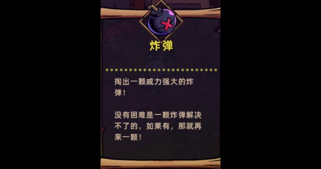 1.炸蛋,向前扔出一个炸弹 2.回旋镖,向前方抛出一个可以回旋的飞镖 3.香蕉,可以回复部分血量并留下两个香蕉皮会摔倒 4.应急急救药水,可以缓慢恢复血量 5.应急魔力药水,可以缓慢恢复魔力 6.急冻炸弹,向前扔出一个可以冰冻的炸弹 7.武器背带,可以携带双武器 8.便捷魔法炮台,可以放出一个自动攻击的炮塔,拥有十符可以染上对应属性 9.魔能动力飞盘,可以扔出一个飞盘,在怪物之间弹射,不会马上消失