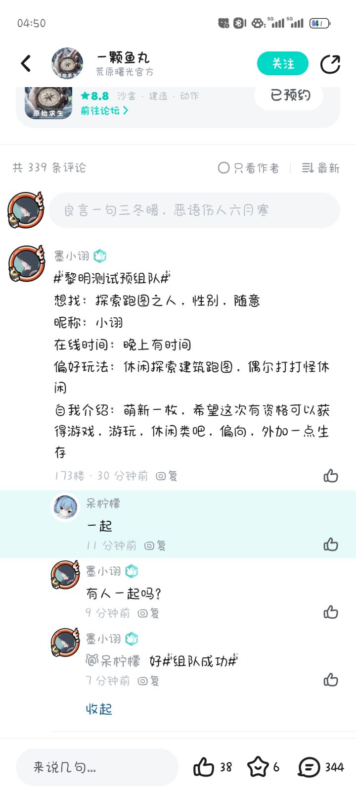 #黎明测试组队 想找一个能长期一起玩的伙伴,刷副本,建造房子,种植都行,性别不限 昵称:嗯嗯在线时间:看情况 偏好玩法:生存自我介绍:佛游戏期待:上测没抢到 希望多放点名额#黎明测试预组队#