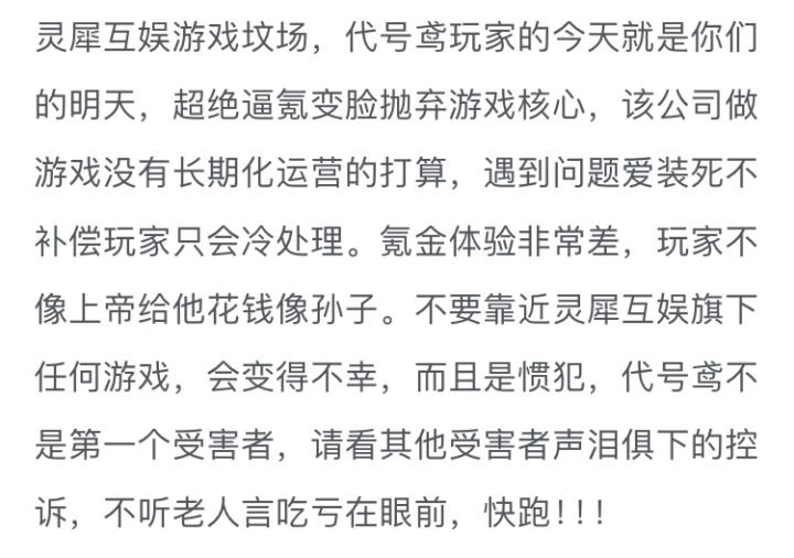 灵犀互娱游戏坟场,代号鸢玩家的今天就是你们的明天,超绝逼氪变脸抛弃游戏核心,该公司做游戏没有长期化运营的打算,遇到问题爱装死不补偿玩家只会冷处理。氪金体验非常差,玩家不像上帝给他花钱像孙子。不要靠近灵犀互娱旗下任何游戏,会变得不幸,而且是惯犯,代号鸢不是第一个受害者,请看其他受害者声泪俱下的控诉,不听老人言吃亏在眼前,快跑!!! 好汉不吃眼前亏!到时候亏了别怪我不提醒
