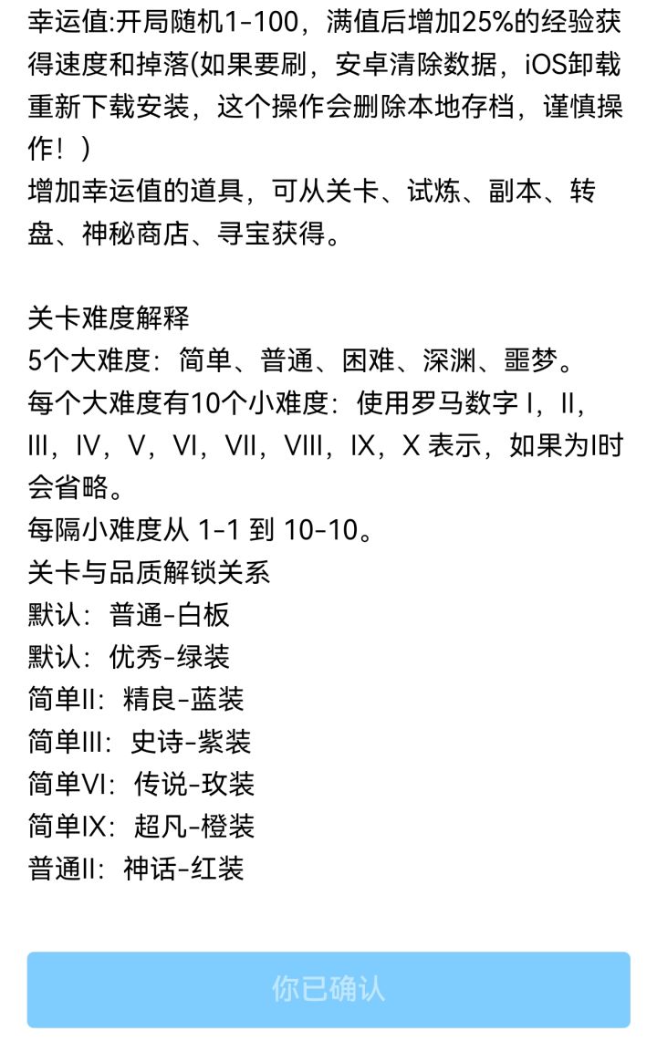 无氪金单机游戏(老板很良心每天20条广告后就免广了) 1.6版本法>弓>双刀>战士选定职业就可以刷开局了,所谓的刷开局就是新号幸运值是随机的,必须要搞个80以上才能很快的把幸运值升到100…幸运值:开局随机1-100,满值后增加25%的经验获得速度和掉落(如果要刷,安卓清除数据,iOS卸载重新下载安装,这个操作会删除本地存档,谨慎操作!)增加幸运值的道具,可从关卡、试炼、副本、转盘、神秘商