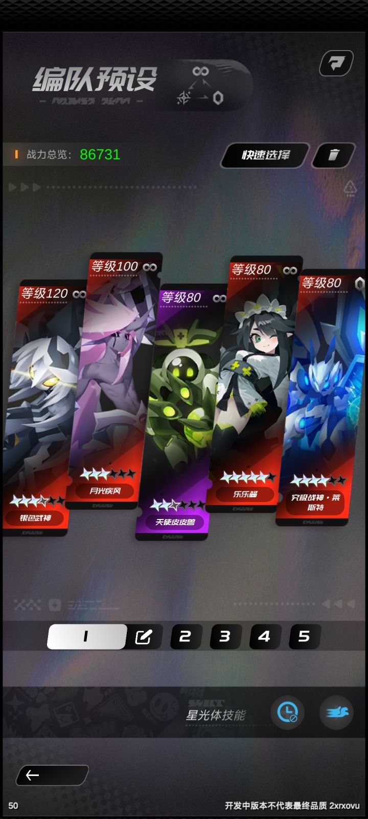 这个阵容绝了Pve绝对的,一个前排,两个输出,两个奶妈,前排看谁能扛,我选的是武神能吸好打竞技,选将军他很肉而且很容易获得,星耀竞技可以,PVP的话还是有人会选择控制类的,吃运气要抽,打pve不行优先度低的要死。只要时间足够,我就能控制到底。不知道bug还是什么,只要让莱斯特放出他的技能,对面就罚站了,他的技能描述上是两秒多,但是罚站的时间超乎我的想象,可能跟数量搭钩,因为是三发,随机但是范围好像