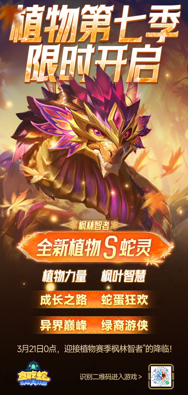 各位亲爱的蛇蛇大人:3月21日0点植物新赛季惊喜上线,全新 S 蛇 ——“枫林智者” 悠然降临!盎然绿意蔓延战局,准备好在葱郁植物世界里开启别样冒险了吗 ?更新内容1、植物新S蛇—枫林智者2、枫林智者专属卡池3、植物、圣光、雷电蛇灵心愿卡池4、7日植物A圣物活动5、植物赛季通行证6、植物、圣光、雷电蛇灵圣物返场礼包(已有不显示)7、蛇蛋狂欢8、成长之路9、血脉争霸赛10、枫