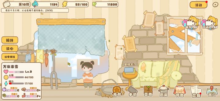 前期有点困难,领养两个孩子后就 容易多了。关于赚钱,前面去垃圾桶捡垃圾然后去当铺卖,低价高卖赚取本金、然后码头开放的时候买鱼饵鱼竿钓鱼,在背包里杀鱼做成清蒸鱼或者水煮鱼(没有菜谱去便利店买), 还可以厨房做菜卖出去(打折周买、回收周收更划算)关于孩子,便利店有属性加成的东西背包使用,这样属性加成比较快,然后新手福利几个广告要看完,点左下角属性哪个不够加哪个,每一个课程都有标识,学完才加学分,学