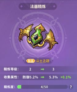法器精炼是本赛季新出唯一成长系统,还是简单聊一聊应该怎么分配资源,避免后续有未知的坑踩描述上来说,每精炼法器1级,即可提升其对应的“收集属性”2%(乘算),实际提升就是多0.1%啦例如图中,极品法器原始收集属性为5%,提升1级后则变为5.1%,50级全部精炼完,最后应该是10%的收集属性,所有的法器都是这个模式。那么问题就来了,我们应该先逮着一个法器精炼到底呢,还是平均分配到多个法器,这里还
