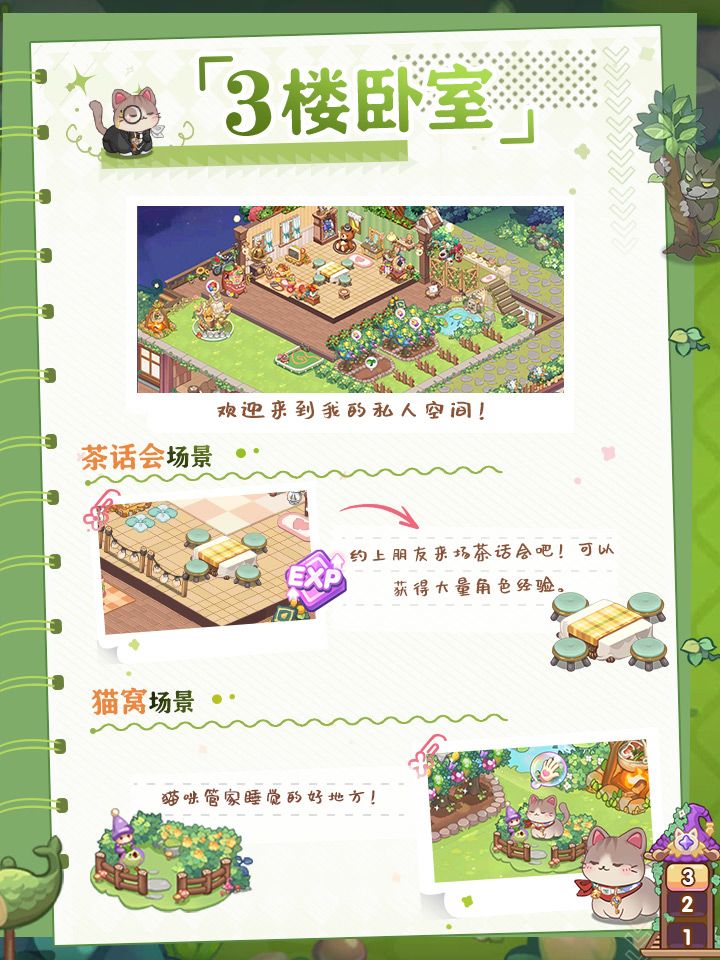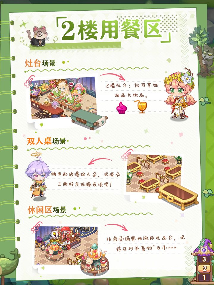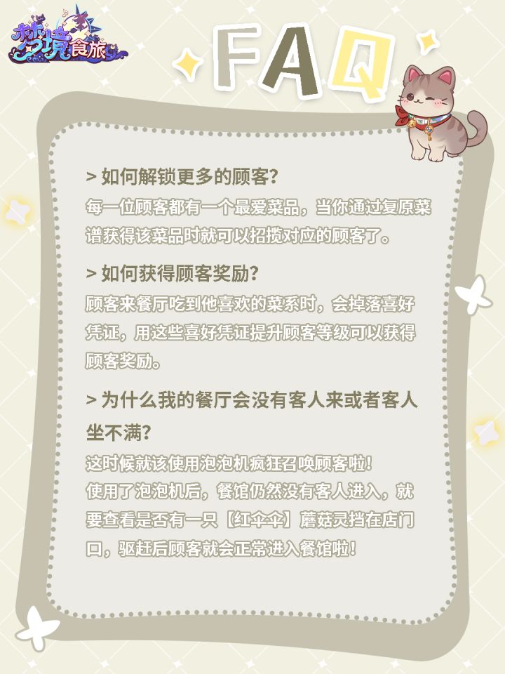 ⭐会说话的猫管家⭐固执守门的红色蘑菇⭐无声潜入四处奔窜的夜精灵梦境餐馆营业时,可能会迎来一些出其不意的小动物~馆长们经营的时候,可以留意一下他们的出没哦!经营Tips:1、当亲爱的管家猫咪头上出现手套图标时,要陪他好好玩耍呀!2、泡泡机按到冒烟也没有客人进门?留意餐馆门口是不是出现了红伞伞,点他!3、夜猫出没,快速点击可收获掉落的云币!不能放过——