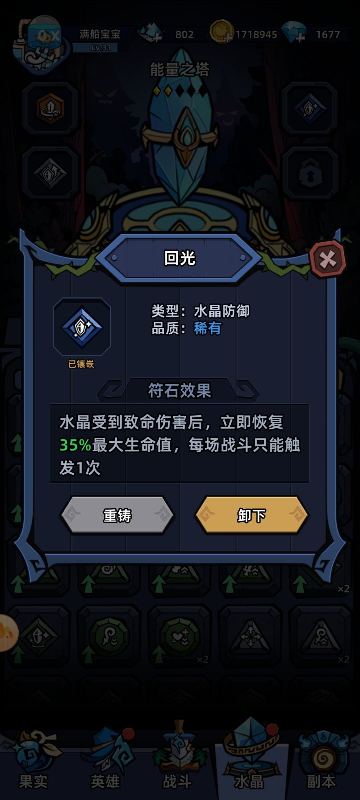相信很多小伙伴都卡在了6-6-和6-9的鲸鱼BOSS这里,难点一:这一关BOSS出场会锁定水晶为仇恨目标,并且输出技能是多段伤害,所以水晶免疫次数根本扛不住,难点2:BOSS很肉,除非战力爆表不然很难秒掉。所以我们需要切换它的仇恨目标,装备一个图中的任意颜色符石,给#萌萌塔防 水晶一个假死状态,把前排坦克转到后排抗伤害就可以0血通关了,