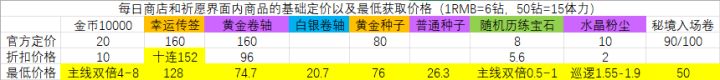 已更新V2.0版本首先要先确定官方对每样东西的定价,以及以最低钻石折扣且能重复获取的最低价格为锚点。PS1:之后所有的亮黄色背景的均为最低获取价格,不再赘述。PS2:要是把所有商品内的价格全部贴出来未免冗长,所以还请各位结合帖子在游戏里对应价格比较数据。以幸运传签=152钻(之所以不选每日商店打折128钻的价格是因为那个重复率不够,一天运气好最多能买6个左右吧#),黄金种子=76钻为锚点,