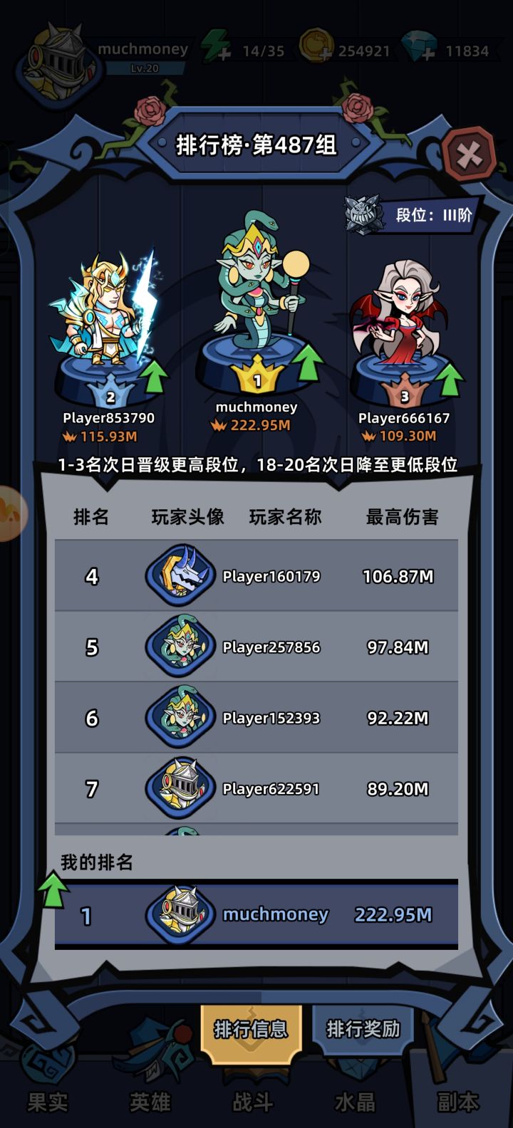 双子等级77,局外面板攻击力10万整,果实都是低级的没升几次,零氪,主线8-3、8-4,战力九十多万但不重要毕竟实际全靠双子(战力很多都是果实和那些符文虚涨的,特别是最虚的生命值加的战力),那些个虚头巴脑的战力压根增幅不到双子头上。每一局都很简单、纯粹。“出影分身就是碾压,没出就快速胜利。”这游戏就是这么简单,每天上下线看看把体力值清空的小妙招。看图三就知道我小怪都打不过但不妨碍我出了影分