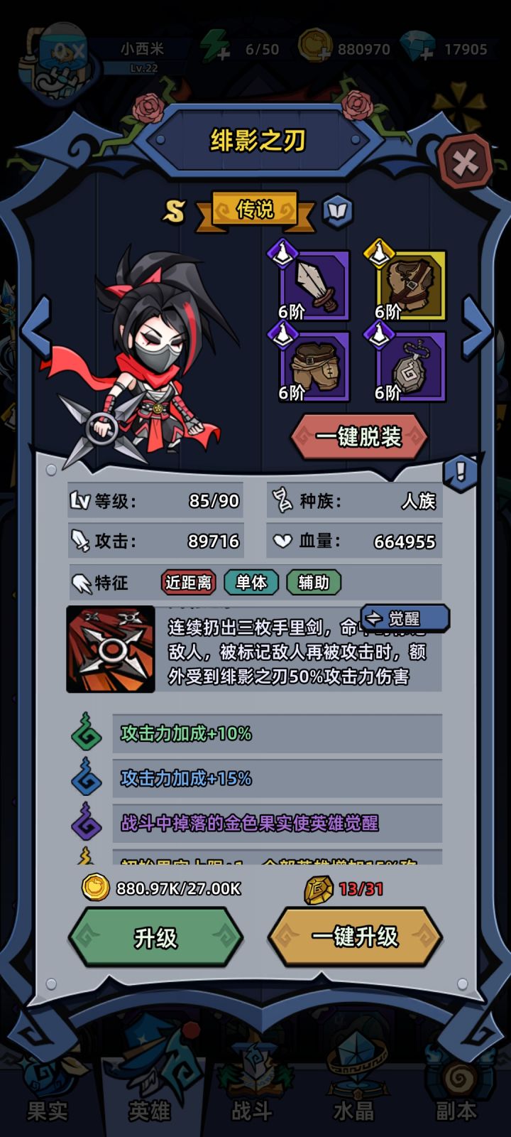 输出机制特点 - 核心输出方式 :消耗能量进行扇形射心,觉醒后可触发叠加的三心爆炸效果,射心数量与能量相关,能量越充足,单次射心数量越多,叠加伤害和爆炸效果越显著。- 输出优势与局限:单体输出能力极强,后期配合特定果实可轻松秒杀BOSS 。觉醒后搭配穿透、弹射等果实,能对群怪造成高额伤害,但未觉醒且缺乏适配果实时,强度较低,甚至不如部分A卡 。 果实搭配特点 - 质变果实是关键 :伤
