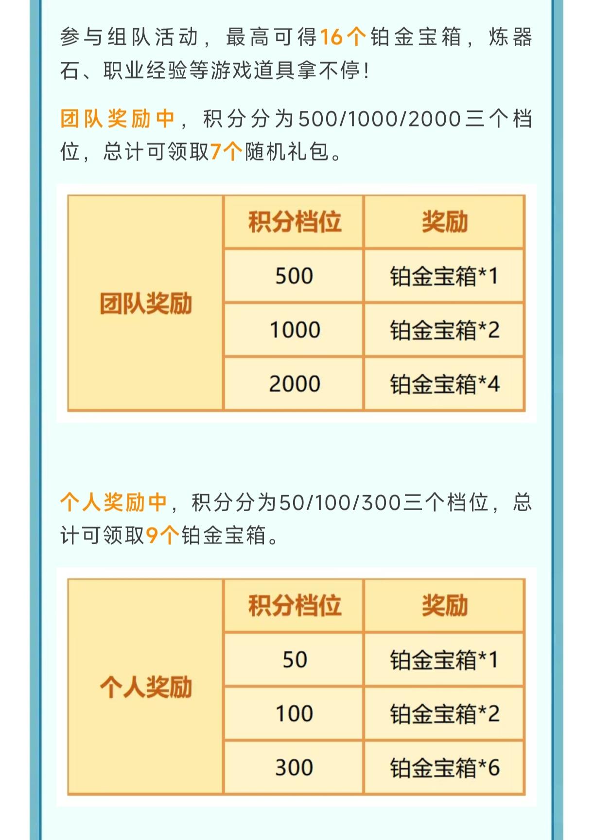 一、活动核心信息速览昨天官方推出组队开箱活动,参与最高可得16个铂金宝箱,还有炼器石、职业经验等道具,不过纯金金钞、限定周边这类好东西概率极低,大多是洗练石、职业经验这类普通奖励。活动开启常伴随大佬大额充值,同时就可能会有新英雄、返场武器等热门活动,预计近两天就有新动作。活动时间分两个阶段:组队期为2025年10月11日 - 10月14日;充值期是10月15日 - 10月19日。参与范围仅限A
